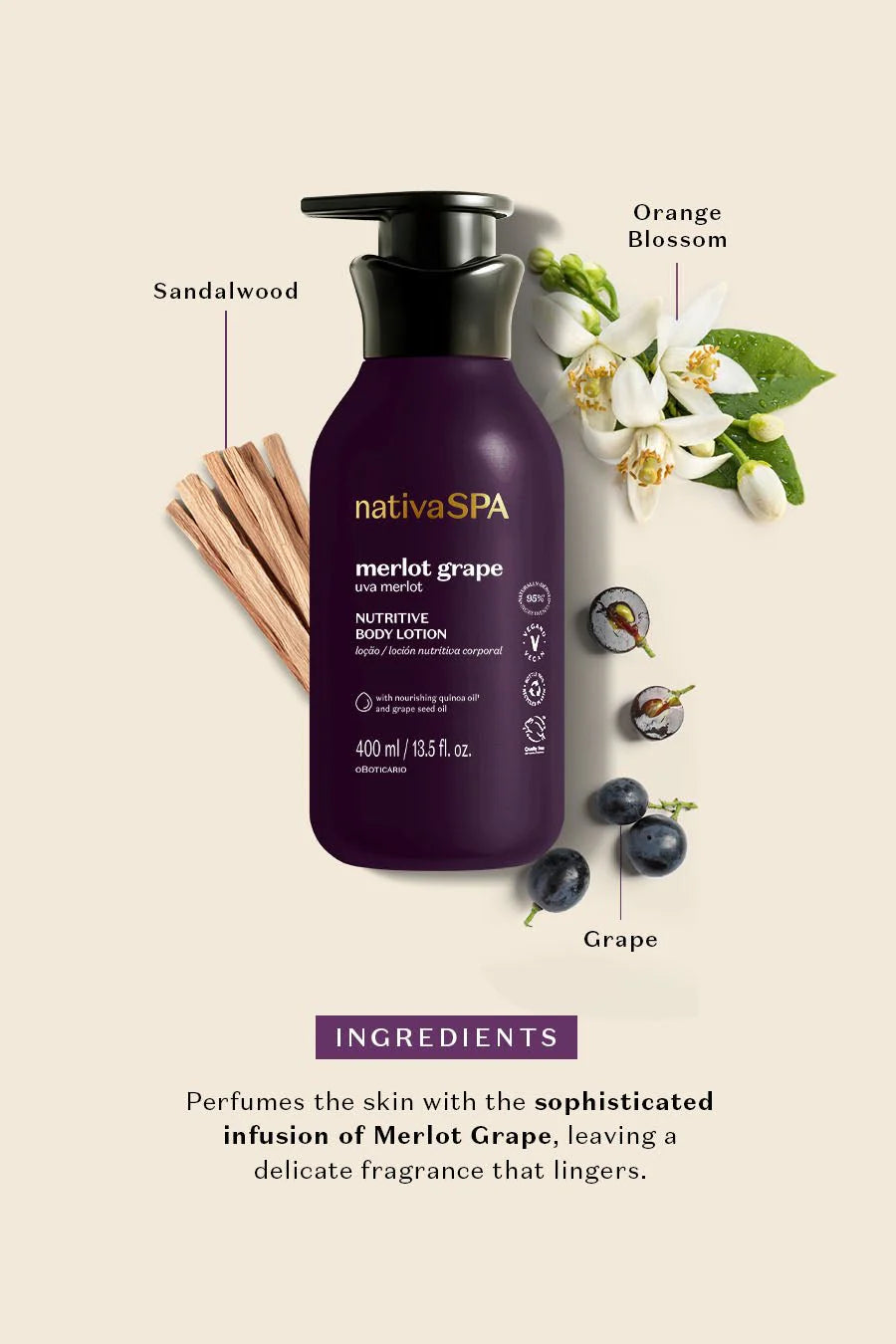 Perfumes the skin with the sophisticated infusion of Merlot Grape, leaving a delicate fragrance that lingers.